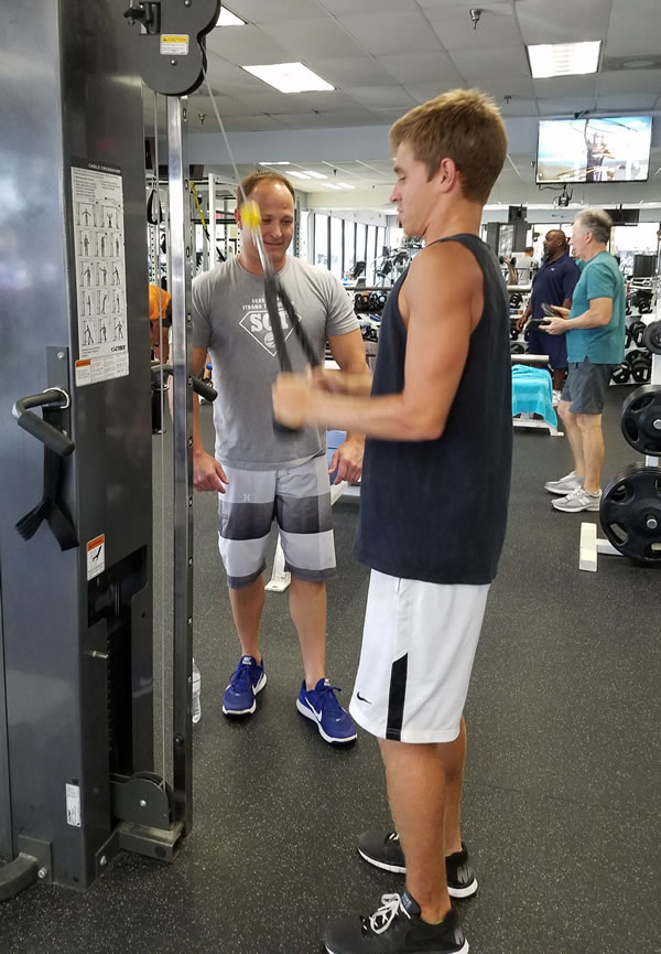 - Tony trains Scott on lat pull downs.