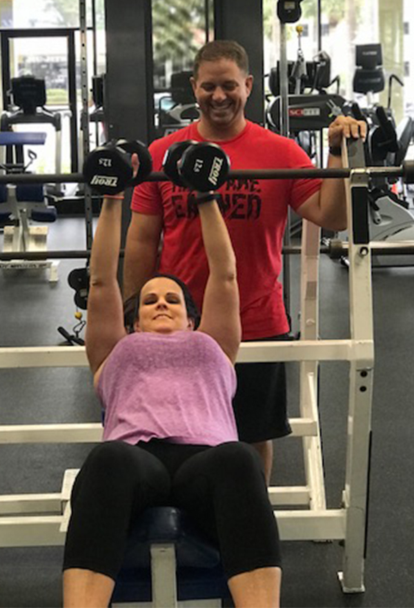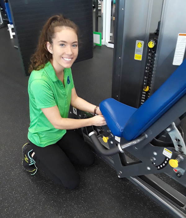 - Erin uses the functional trainer to build back strength.